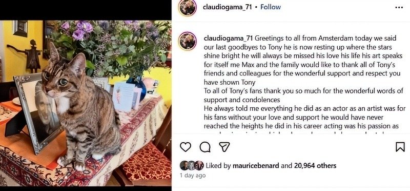 In his Instagram post, Claudio didn’t just share a photo of Tony. Fans could see that he had arranged photos and other keepsakes on a table. Adding a touching touch, Tony’s cat Max was sitting in front of one of the framed pictures. The photos were credited to Jim Warren